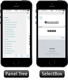 For mobile devices, there are two options, a dropdown panel menu with items in a tree format or a select box using the browsers own UI elements. Choose a format in the template's menu settings.